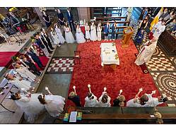 Die Eucharistie (griechisch für "Danksagung", in der evangelischen Kirche als "Abendmahl" bekannt) ist die Feier von Tod und Auferstehung Jesu, ihre Feier - die Heilige Messe - der wichtigste Gottesdienst und Höhepunkt des christlichen Lebens. In der Eucharistiefeier werden Brot und Wein zum Altar gebracht und unter Vorsitz des Priesters in "Leib und Blut" Jesu gewandelt. Das ist kein Hokuspokus, sondern das Vermächtnis Jesu.