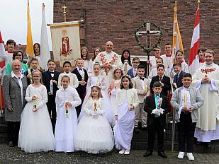 Heute am Weißen Sonntag startete die Feier der Erstkommunion in Mariae Namen und St. Laurentius. Untenstehend ein Bild aus der heiligen Messe in Mariae Namen und ein Gruppenfoto der Mädchen und Jungen, die zum ersten Mal am heiligen Mahl teilgenommen haben. Wir wünschen den Kommunionkindern und ihren Familien zu diesem besonderen Tag Gottes Segen und dass sie immer wieder spüren, das Jesus als ihr Bruder und Freund an ihrer Seite ist.